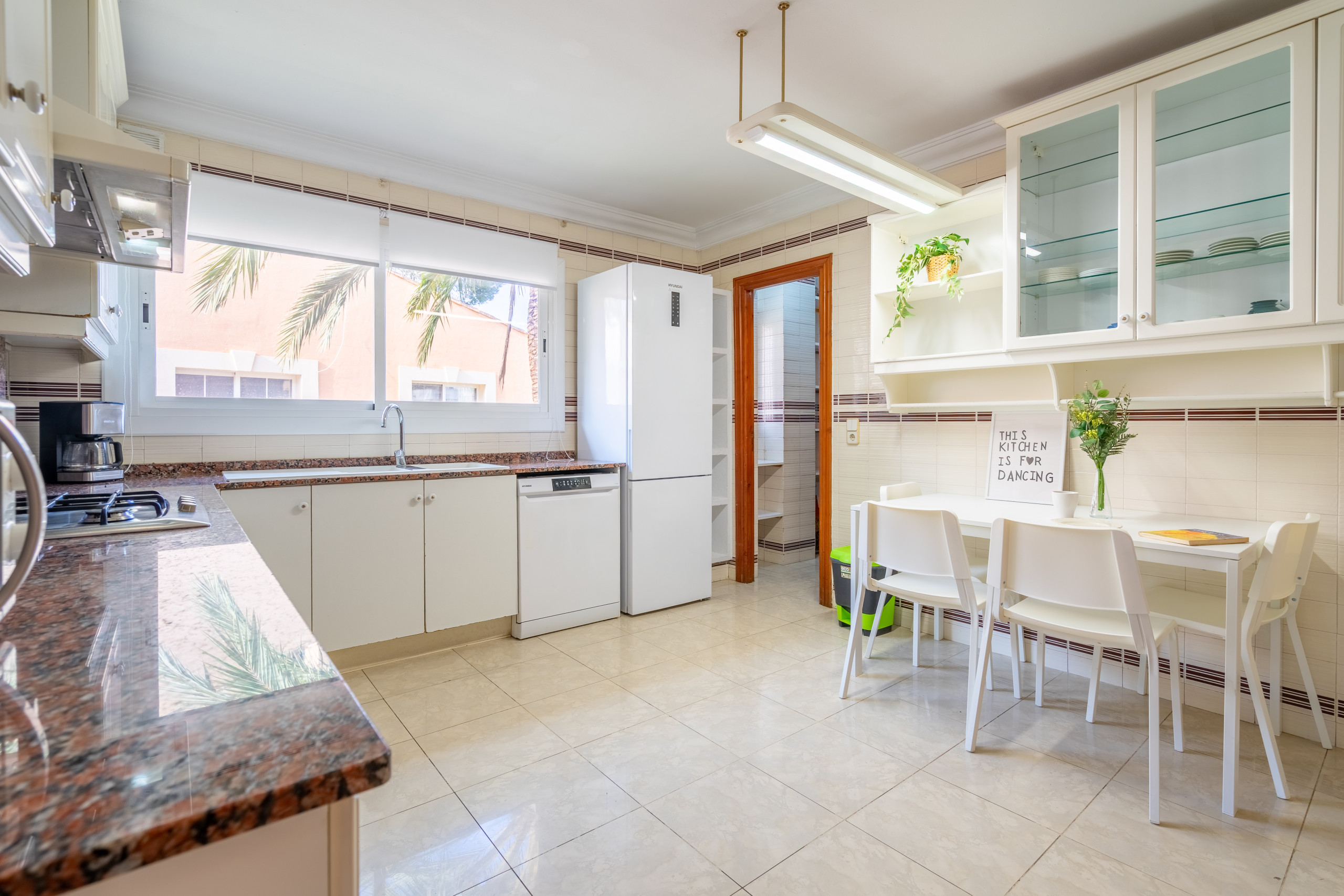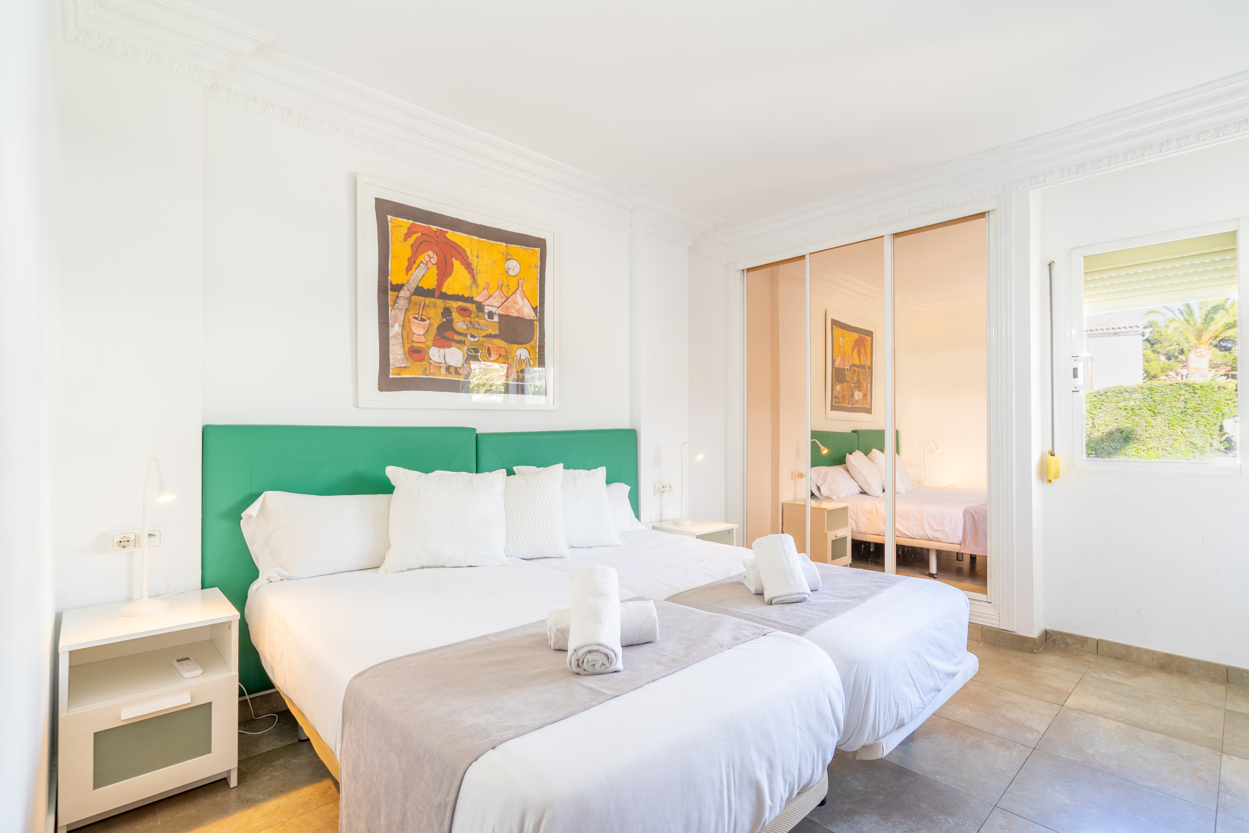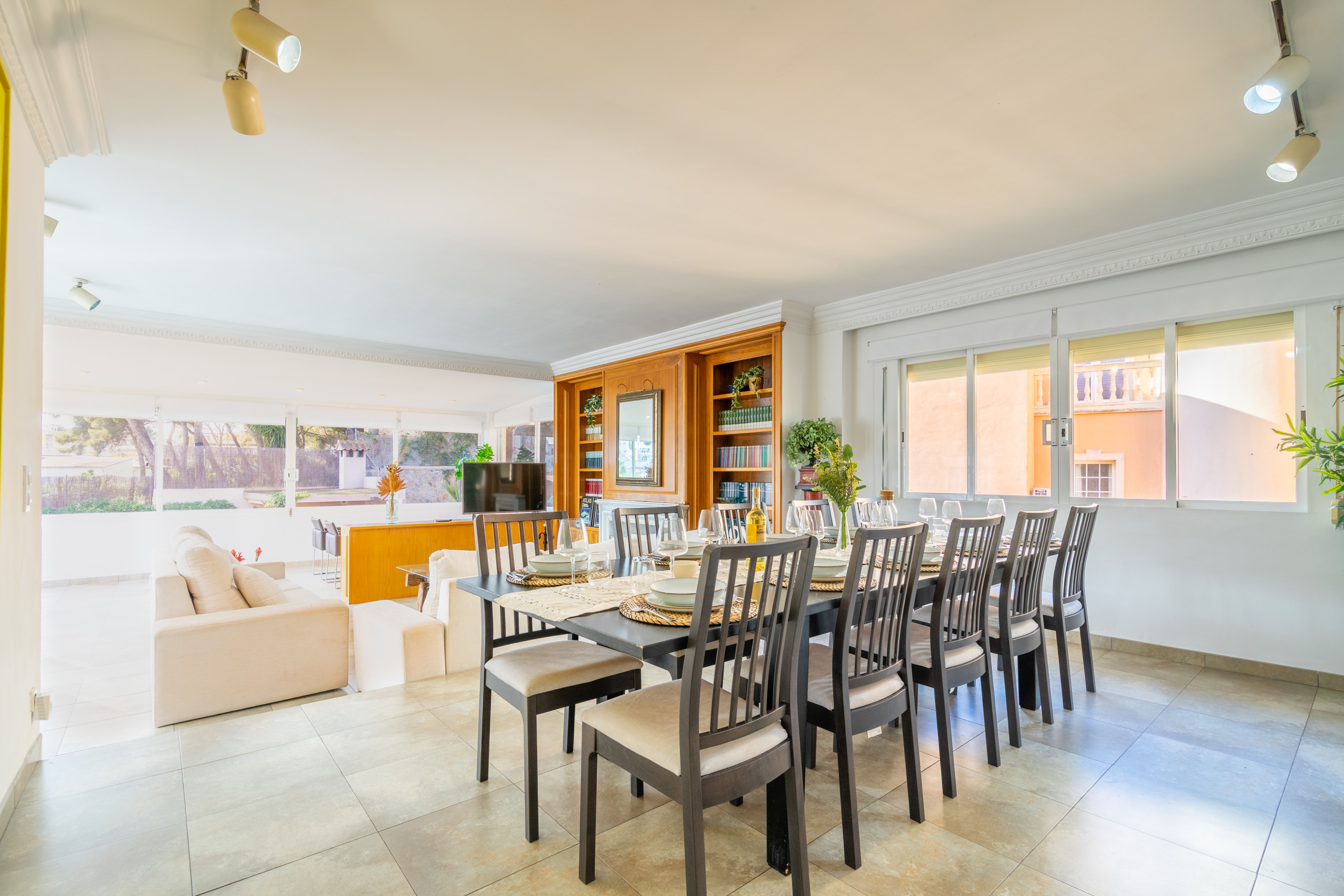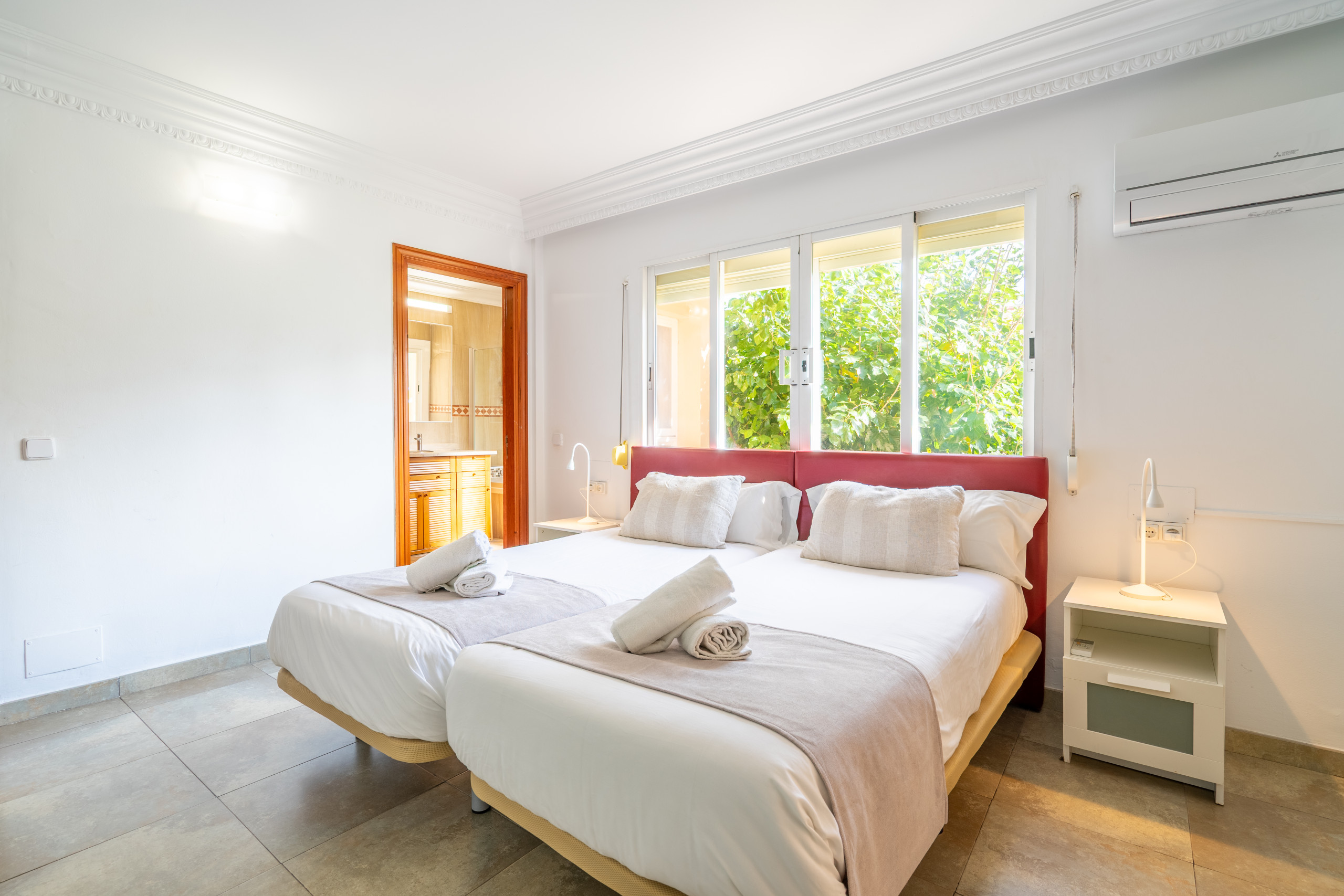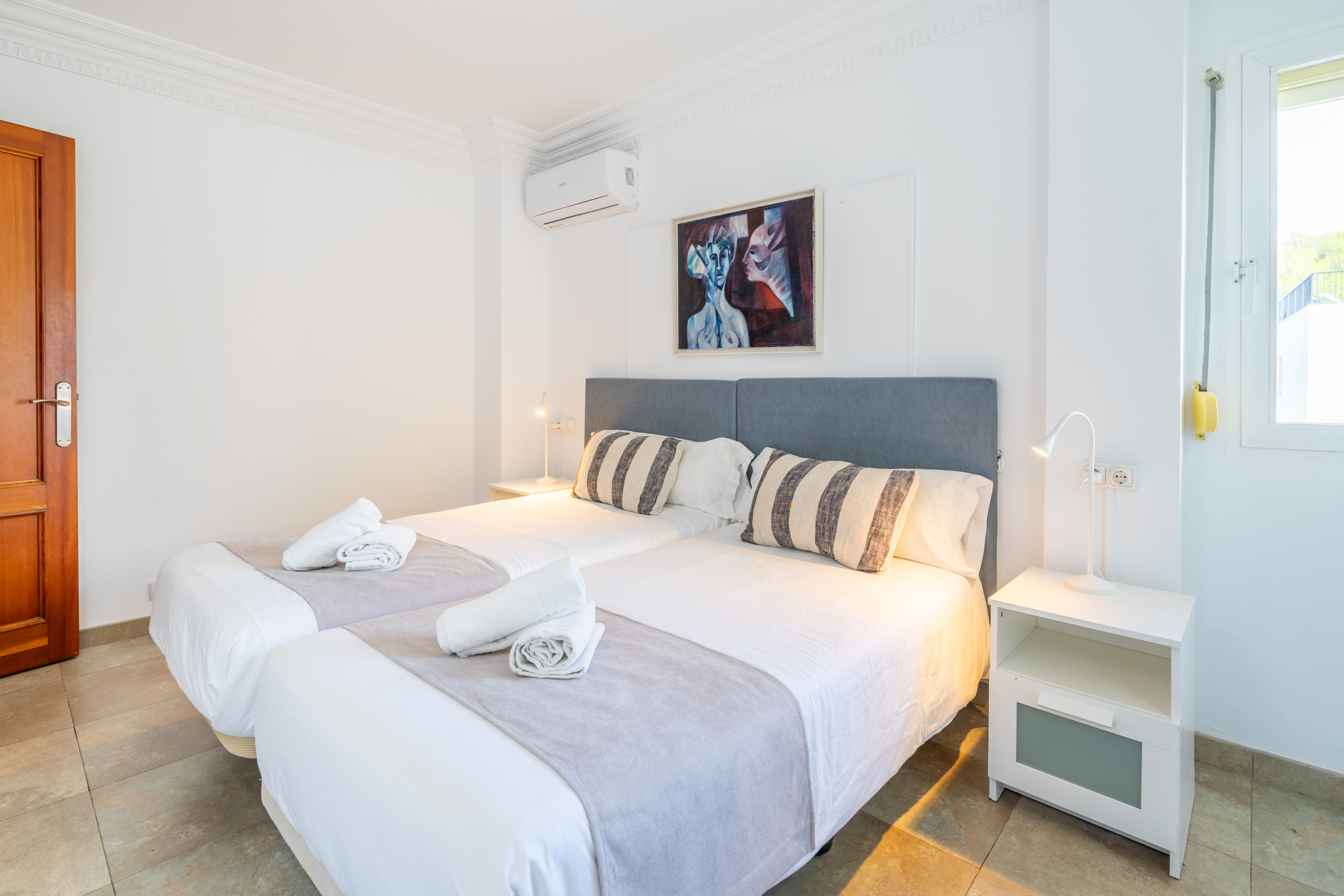 Great quiet location only 5 mins walk to beach, buses and restaurants. All rooms large with plenty of space for 12 guests, nice pool/garden area and well equipped kitchen and clean linen. Generally a bit tired inside and out compared to photos, but still good value for money.