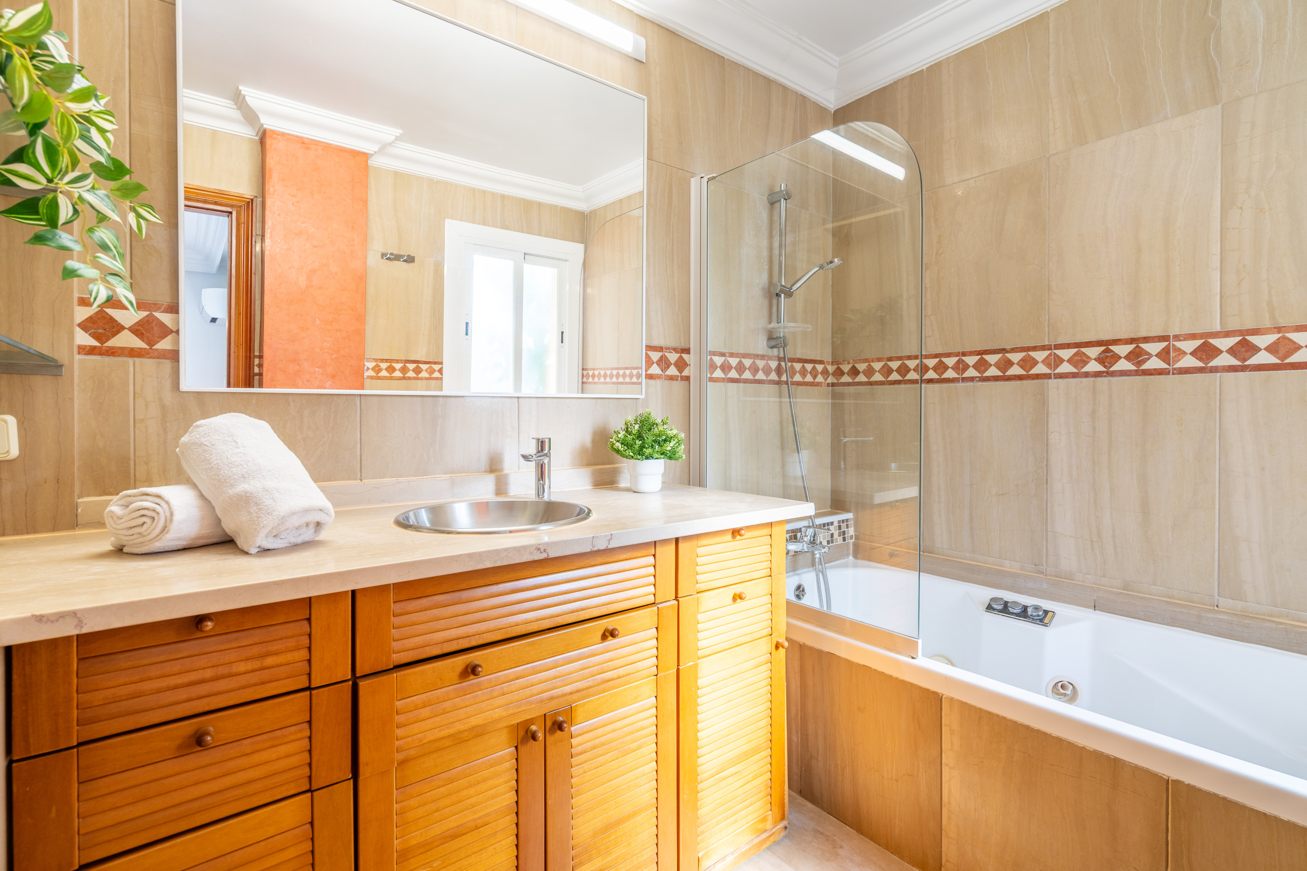 Wir waren mit 12 Personen vom 24.02.18 bis 4.03.18 in dieser Villa. Die Lage ist mehr als genial. Es gibt alles Bäcker, Supermarkt, Busanbindung nach Palma, Restaurants, Bars, Caffes alles in nächster Umgebung. Die Ausstattung des Wohnbereichs ist etwas sehr mager. Keine Sets oder Tischdecken, Leerer Wohnzimmerschrank und ein paar Polster auf den harten Holzstühlen waren kein Luxus. Und die total trübe Fensterfront hätte man nach dem Winter schon putzen können. Die Küche ist schön groß und für 12 Personen eingerichtet. Super Kühlschrank...Speise, Herd mit Ofen und zwei Kaffee Maschinen echt super.. Leider waren wir wohl die ersten, Fernseher ging nicht und einige Küchendinge wie Feuerzeug, Reiniger für Geschirrspüler, Holzbretter, Schüsseln und Eierbecher z.b. fehlten. Je nach Anreise kann man es ja auch nicht gleich reklamieren oder besorgen war aber weiter nicht schlimm. Die Mitarbeiter von Home Villas waren sehr freundlich und haben alles sofort geregelt. Die Außen Anlage war nicht gepflegt. Alles vermost, die Liegen total verschimmelt, sind wohl immer im Freien. Der Pool war gereinigt und in Betrieb. Die Bäder sind in Ordnung, ein Fön, immer heisses Wasser und ein erstaunlicher Wasserdruck. Viel Ablage Möglichkeiten und genügend Handtücher. Wirlpool nicht in Betrieb, Dampfbad geht auch nicht. War aber nicht tragisch. Handtücher für Liegen auch da. Aber diese Betten, alles nur Gestell Betten teils gebrochen am Holz oder am Metallrahmen verbogen. Teils sehr dünne Matratzen, quietschen schrecklich ... Etwas fremdlich finde ich die Kautionsregelung, man gibt Bargeld ab und ohne Hausabnahme wird dann nach 7 Tagen das Geld überwiesen. Hab ich so noch nie erlebt.... Die Aufteilung und Größe der Zimmer , über drei Etagen und teilweise eigenem Eingang ist Perfekt. Nur ein Doppelzimmer hat keine Toiletten und Bad Möglichkeit. Für mehrere Personen ein perfekt aufgeteiltes Haus mit Super Lage